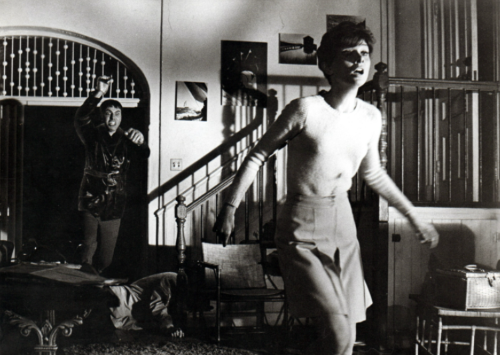 Tagline: The blinds moving up and down. . .the squeaking shoes. . .and then the knife whistling past her ear. . .