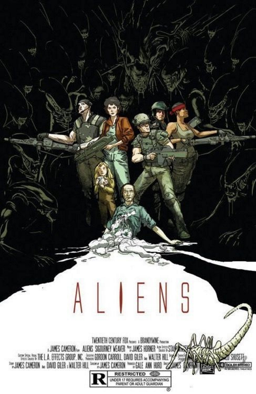 How about this Aliens poster by Riley Rossmo? Whooo-hooo! “Game over, man. Game over.”