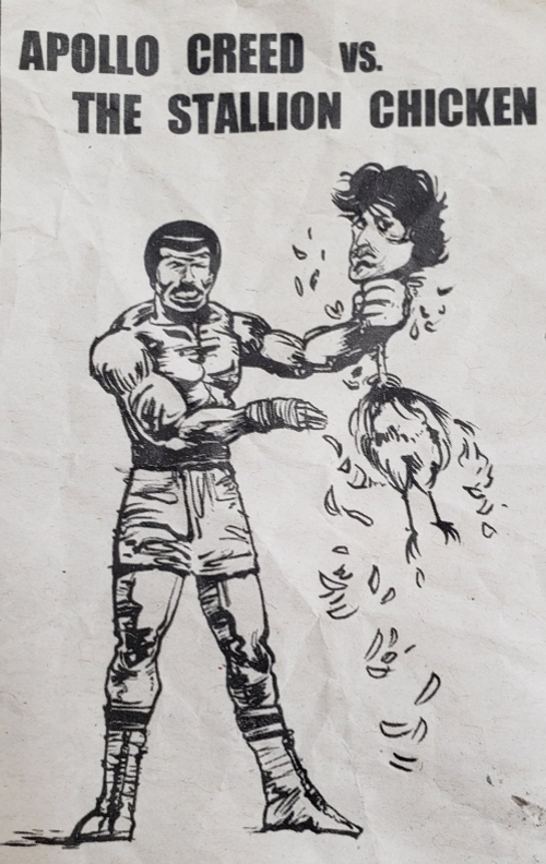 Remember in Rocky II when Apollo was trying to goad Rocky into a rematch and Apollo ran a full page ads in newspapers calling Rocky the Stallion Chicken? That’s the art that appeared with the ad.