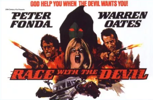 Brad Gullickson at Film School Rejects writes about a movie that definitely fits my criteria of a drive-in movie. Race with the Devil is a low-budget movie featuring Peter Fonda and Warren Oates as a couple of buddies who with their wives stumble on a Satanic human sacrifice while camping out. Before you can say, “Run!” the Satanists are after them with the thought of four more sacrifices.