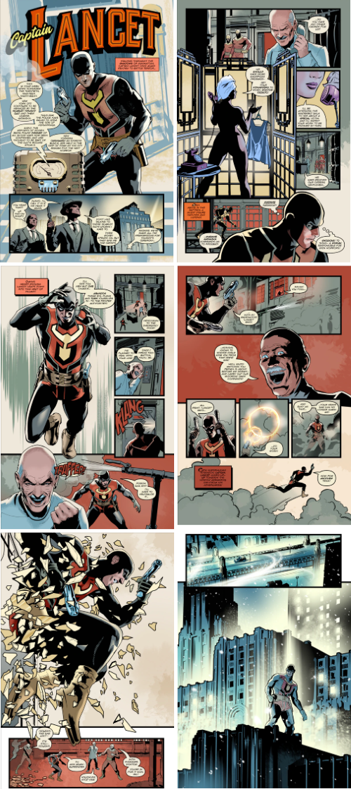 Enter the story’s hero– Captain Lancet. He’s a 1930’s All-American crime buster* who accidentally creates the world’s greatest villain before waking up a century in the future. He’ll need to adjust to a strange new world– Fritz Lang’s Metropolis with some cyberpunk dystopia sprinkled in– if he wants to overthrow the totalitarian vampire cult that now dominates the future.*some of these things are not, strictly speaking, the truth.