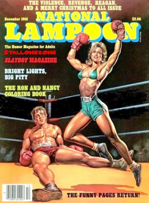 Here’s a blast from the past! Sly Stallone as Rocky makes a cover appearance on National Lampoon’s December, 1985 cover by Boris Vallejo.